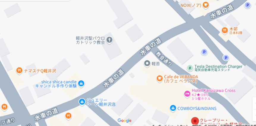 軽井沢駅方面から行くと、軽井沢銀座入り口付近の右側にある「アトリエ・ド・フロマージュ」のY字路を入り、約200m先行くと右側にあります。