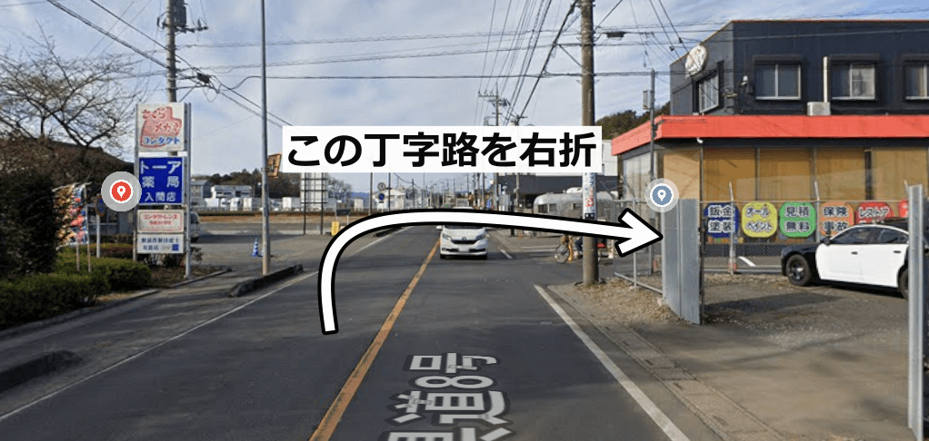 10. 車買い取り・委託販売のA-Lineが見えたら、その先にBody Repair&Customsという板金塗装のお店がある丁字路(右側に「トーア薬局」の看板があるのでそちらの方が見やすいかもしれません)あるので左折