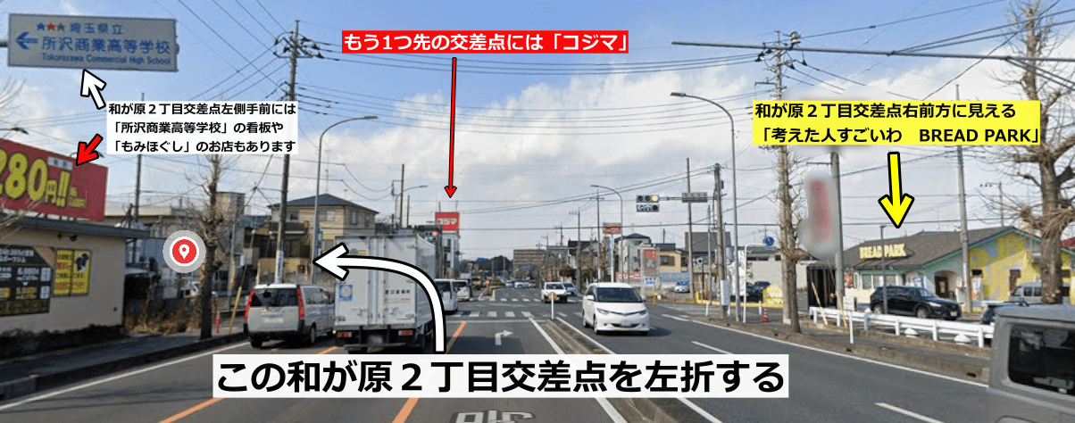 和が原2丁目交差点画像右前方に黄色い看板が目印の「考えた人すごいわ BREAD PARK」 左手前には「所沢商業高等学校」の案内看板、もみほぐし店あり